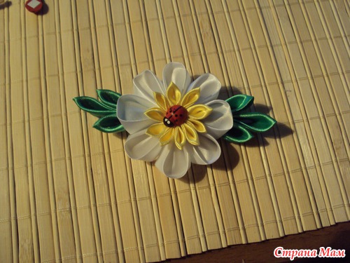 Далее переворачиваем, приклеиваем нашу желтую серединку к белому цветочку и дополняем центр цветочка бусинкой, стразиком, пуговкой, или как я божьей коровкой. Теперь приклеиваем нашу ромашку на заготовочку с резинкой или заколочкой ( в первом посте) и наша заколочка готова!