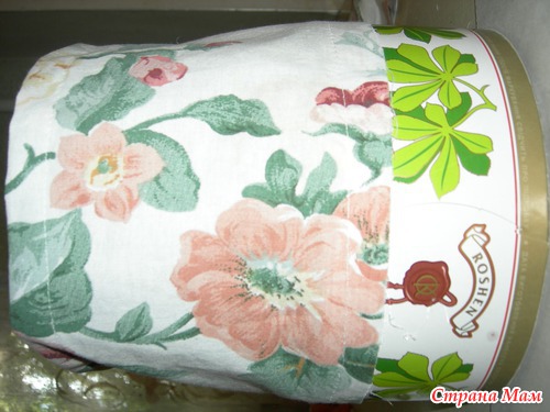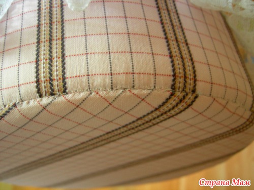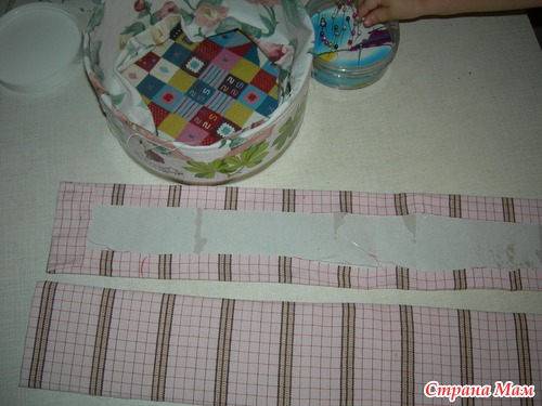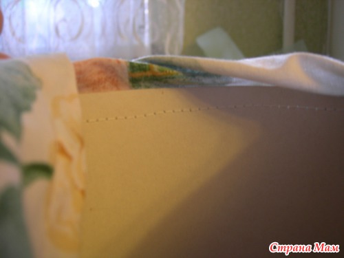 2. Формируем "шапочку" из ткани, предварительно подогнув ткань и прострочив бок и верх, оставив дырочку для шнурка. Этот "колпак" я сразу приклеила к коробке, а потом прострочила для надёжности.