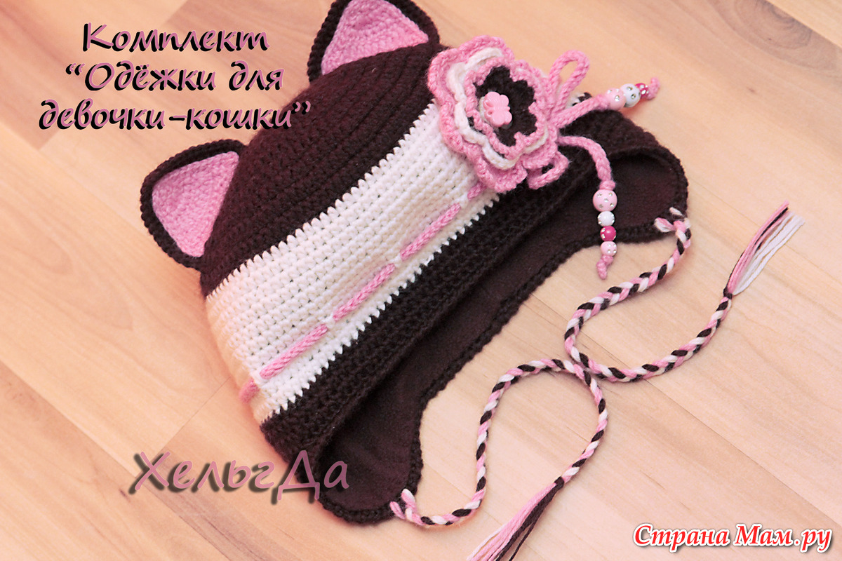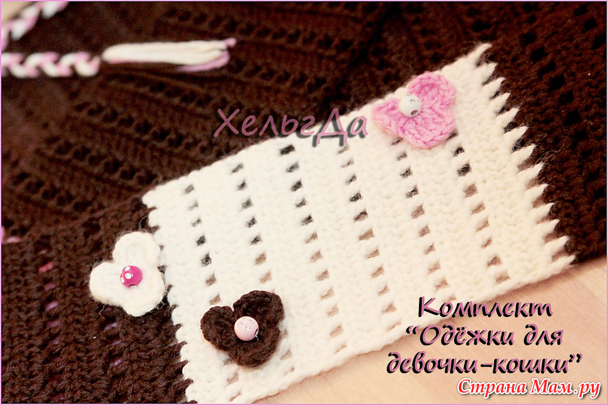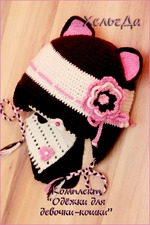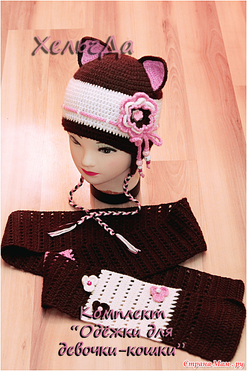 Добрый день! Связала на заказ для 2.5летней девчушки комплектик, который назвала "Одежки для девочки-кошки" (такую шапочку вязала в прошлом году, только вместо шоколадного был использован тогда серый цвет). Длина шарфика 1.5 м, чтобы можно было обматывать два раза вокруг воротника (все-таки комплект зимний), подклад сделан из флиса и аккуратно пришит вручную. Ниточки "Кроха" (полушерсть), крючок № 2.5 для шапочки, № 3 для шарфика.