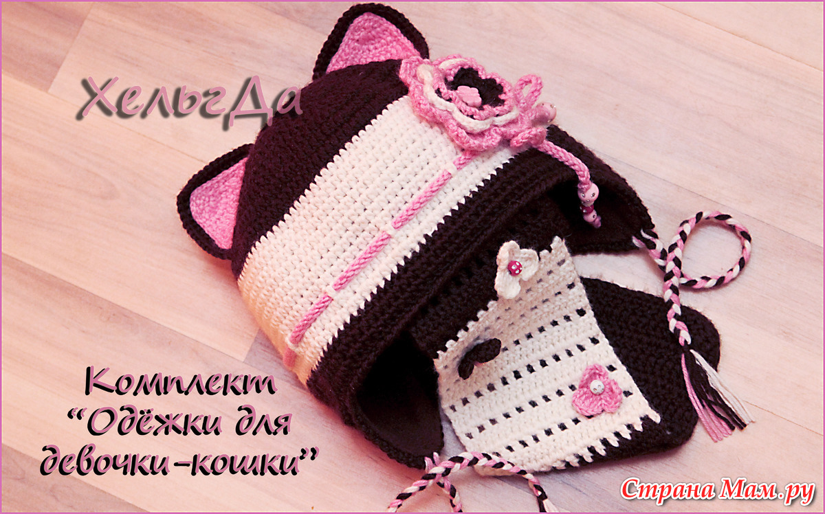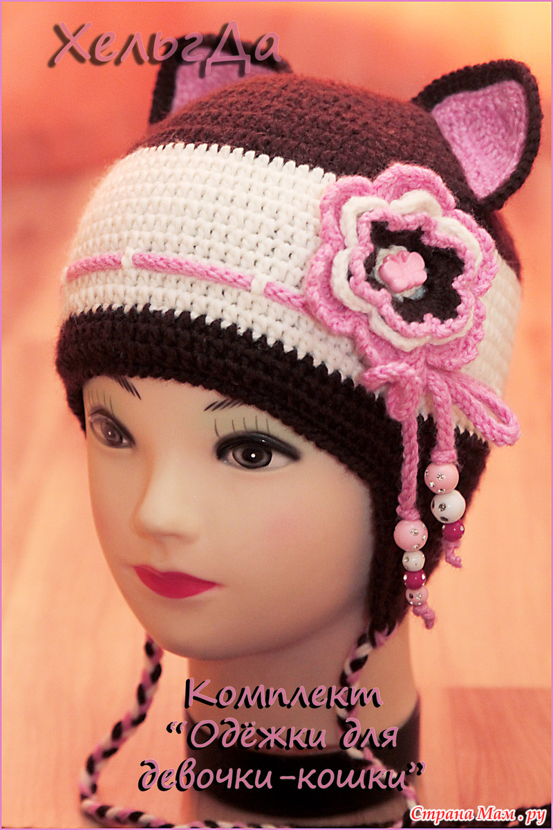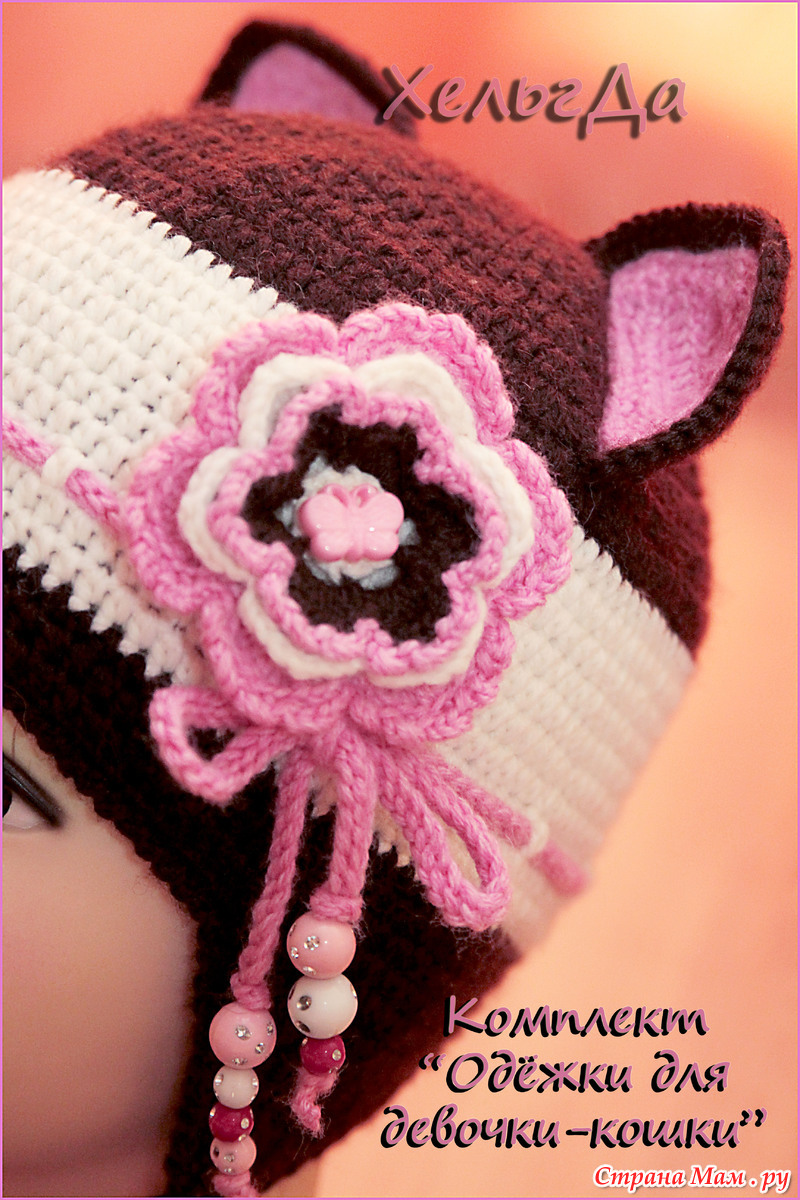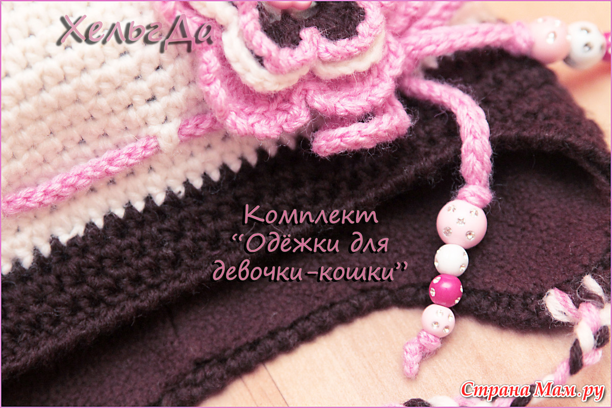 Добрый день! Связала на заказ для 2.5летней девчушки комплектик, который назвала "Одежки для девочки-кошки" (такую шапочку вязала в прошлом году, только вместо шоколадного был использован тогда серый цвет). Длина шарфика 1.5 м, чтобы можно было обматывать два раза вокруг воротника (все-таки комплект зимний), подклад сделан из флиса и аккуратно пришит вручную. Ниточки "Кроха" (полушерсть), крючок № 2.5 для шапочки, № 3 для шарфика.