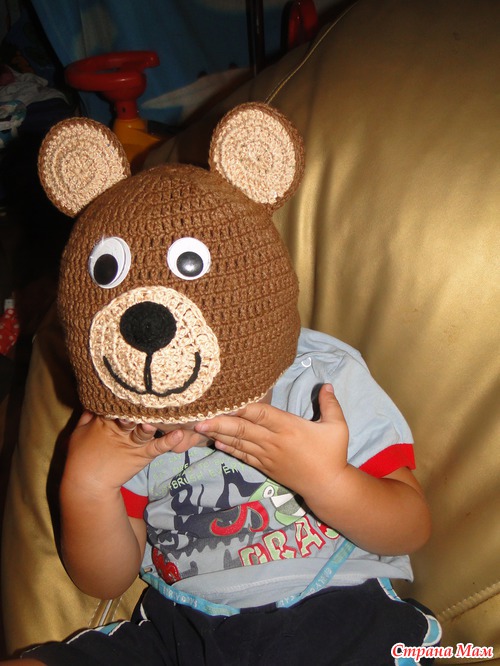 И по образу и подобию сотворила свою)))Нитки Джинс и Саммер, крючок 2,5. Внутри подклад из флиса (по методу 4х-клиньевой шапочки). Глазки приклеила разные, так прикольнее (на мой взгляд). Но самое главное, сынуля одобрил)))