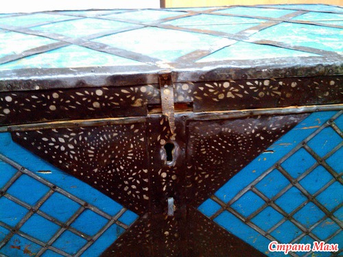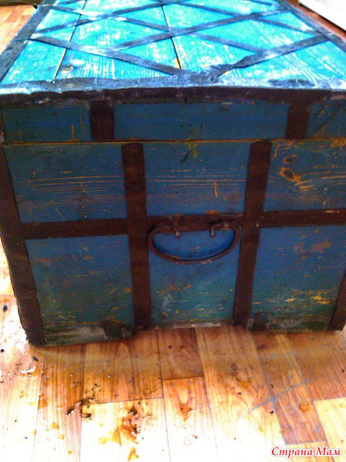 В прошлый раз я писала, что нашла сундук. Но привезти его в тот день мне не удалось. И вот сегодня вечером мы встретились с хозяевами сокровища. Привезли и попробовали немного отмыть. Вообще, надо сказать, что он довольно-таки крепкий парень. Кое-где щербат гвоздями, и обивка железная загнулась, но муж подколотил там-сям, разогнул и он теперь вполне сносен. Гвоздики всё равно хлипкие, думаю, надо клей ПВА в дырочки налить и снова подколотить.