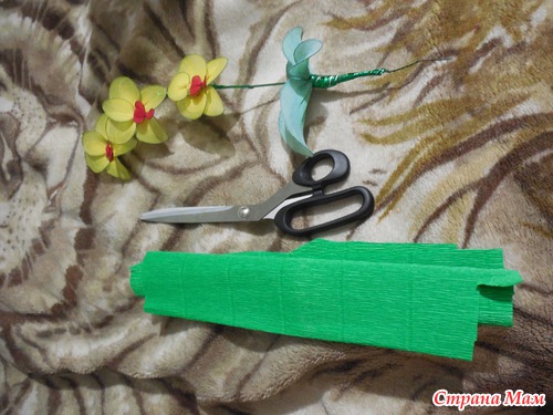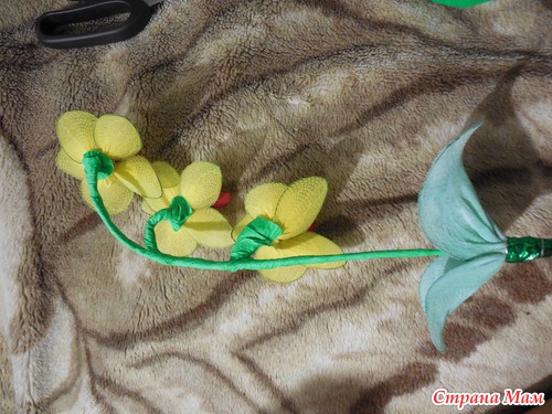 После того, как мы накрутили цветочки и листики, все соединяем. Для этого я взяла проволоку потолще и к ней примотала цветным скотчем цветочки и листики..