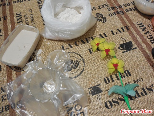 Взяла пиалу, в нее положила пакетик, развела алибастр., залила. Все очень быстро высохло. Вынимаем и вот что получилось.. Листики покрасила для яркости еще краской для батика.