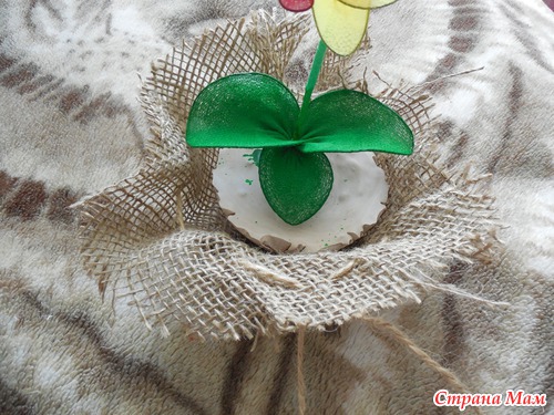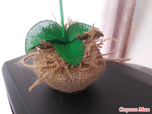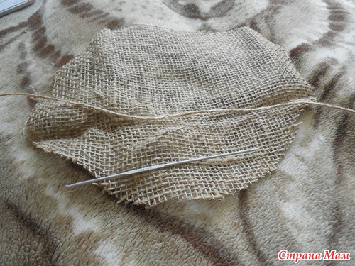 Отрезаю мешковину, продеваю веревочку, ставлю наш горшочек, и стягиваю. Вот что получилось.