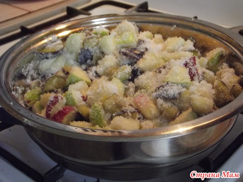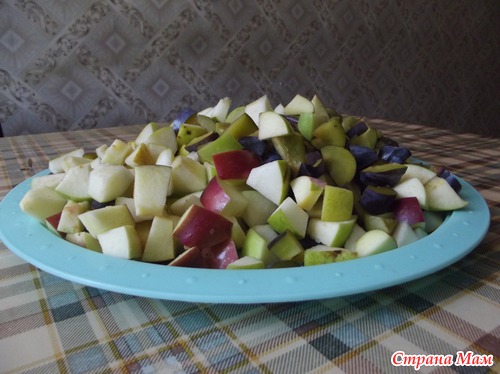 В этом году у нас в саду впервые заплодоносила чернослива (кубышка). Сорвали 30 штук (чуть больше одного килограмма). В таком количестве и некуда бедолагу пристроить. Поэтому решила сделать варенье ассорти: слива, яблоки, груша. Груш и яблок взяла по пол килограмма. Фрукты помыла, почистила, порезала на кусочки. Шкурку с яблок и груш не счищала. Всё перемешала.