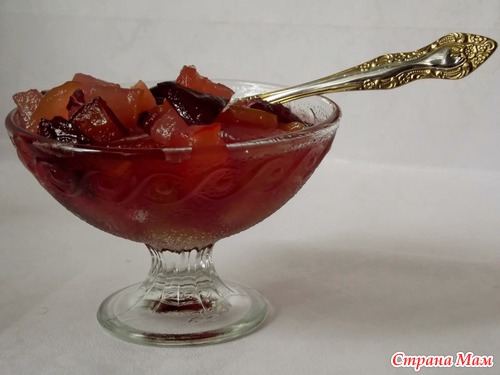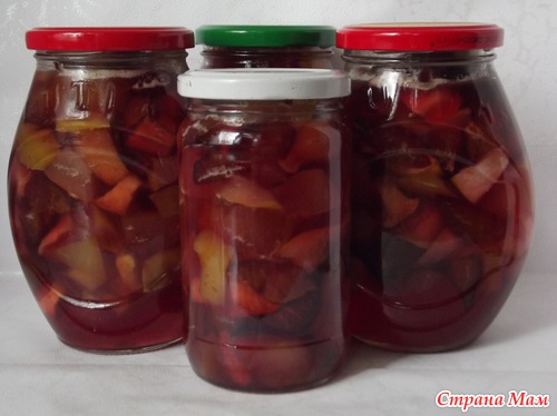 Слива придала сиропу цвет. Яблоки - аромат и кислинку, а груши пикантный, присущий только грушам, вкус. Вот такое чудо-варенье получилось из того что было.