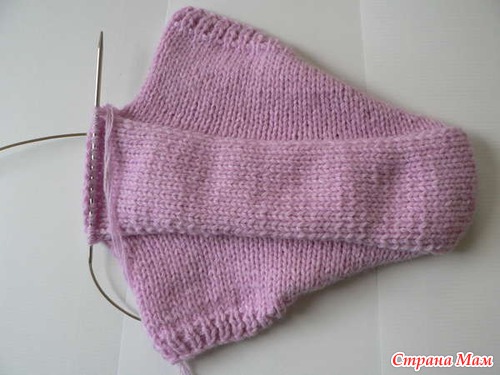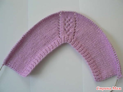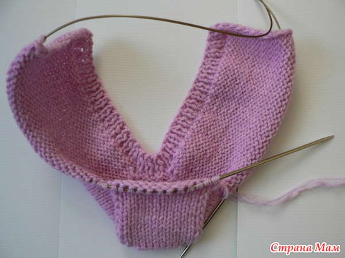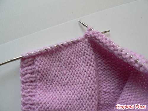 Поворачиваем работу на изнанку. Надеваем на спицу крайние стенки кромочных петель правой боковинки. Вяжем 12 изнаночных петель, 13-ю и 14-ю провязываем вместе.