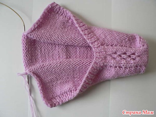 Вяжем пятку. Для этого надеваем на спицу крайние стенки кромочных петель левой боковинки. Вяжем 12 лицевых, 13-ю и 14-ю петли вместе.