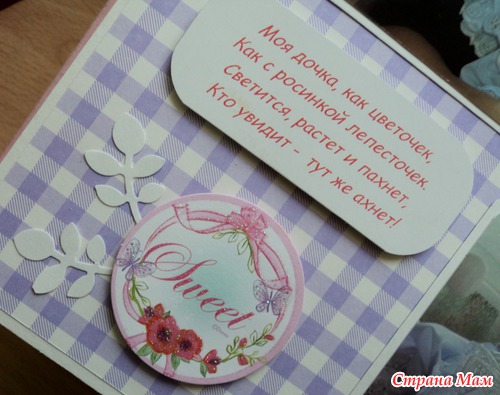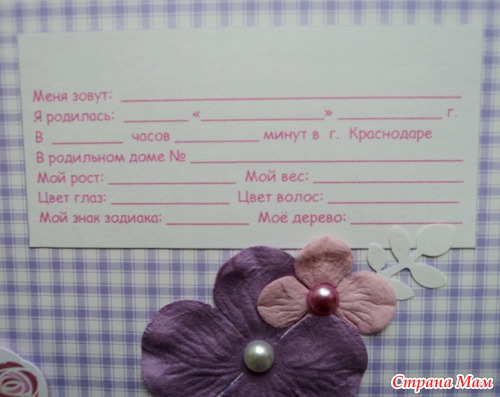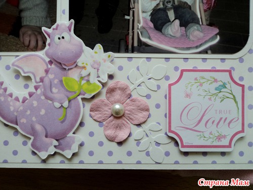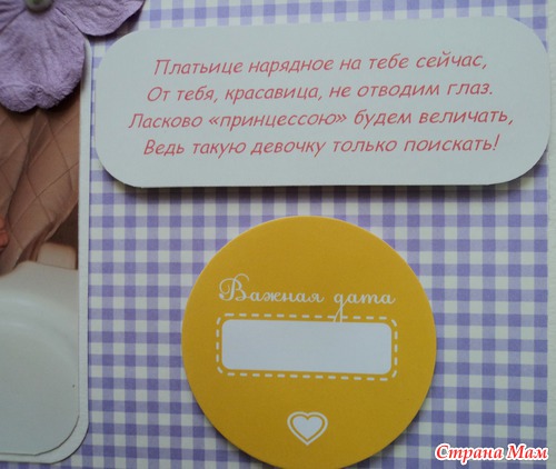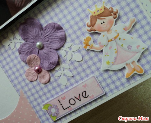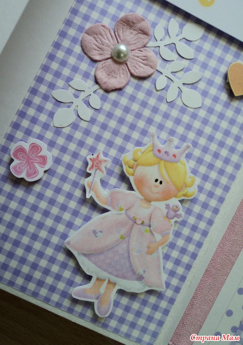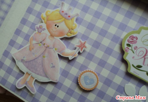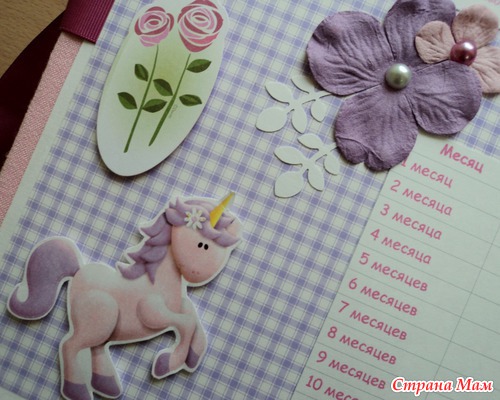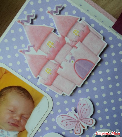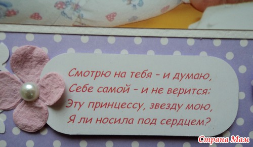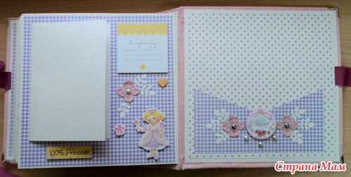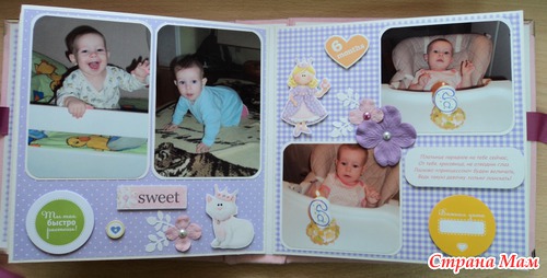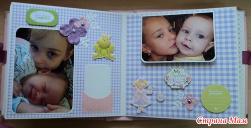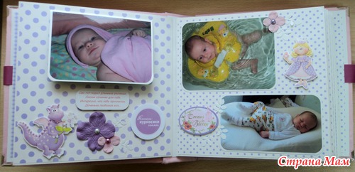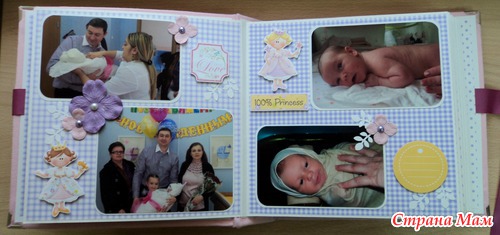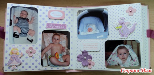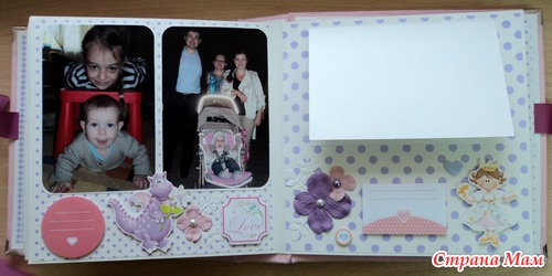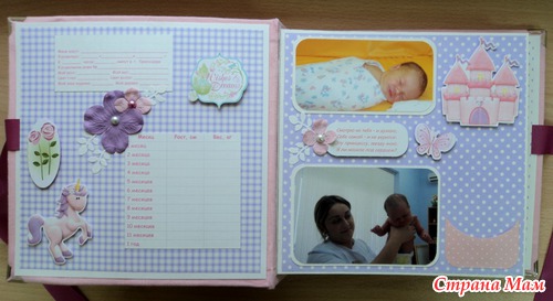 Альбом для маленькой принцессы Анны, 8 разворотов, мягкая тканевая обложка (на ней ещё будет фото в рамочке, заказчица сама сделает - пока нет подходящей фотографии). Есть таблички для записей данных при рождении, табличка рост-вес, достижения, кармашек для диска или невместившихся фото. Последние две странички без фото. Альбом выплнен в нежной сиренево-розовой гамме.