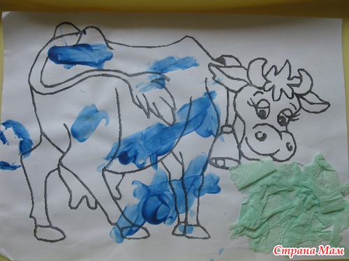 Творчество. Рисуем пятна корове пальчиковыми красками и приклеиваем траву (зеленая салфетка)
