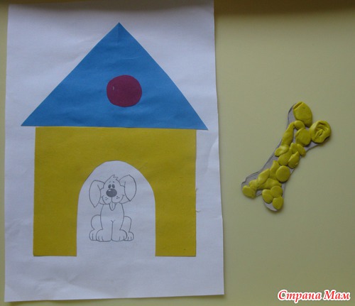 Делаем собачке угощение: косточку (на картон в форме косточки наклеиваем пластилин)