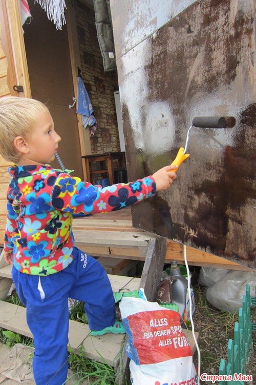 Внук сначала стоял рядом, потом прошелся до песочницы, потом вернулся и с несчастным видом стоял рядом, помахивая валиком для окрашивания.