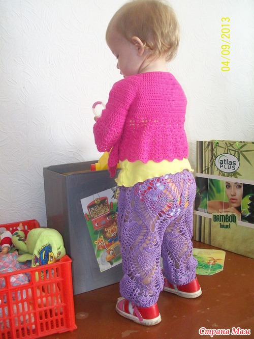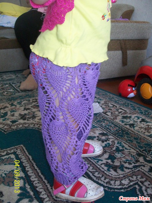 , но увидела штанишки на нашем сайте и влюбилась в них... и вот... они штанишки для моей дочурки вязала впервые.. много раз распускала... получилось???