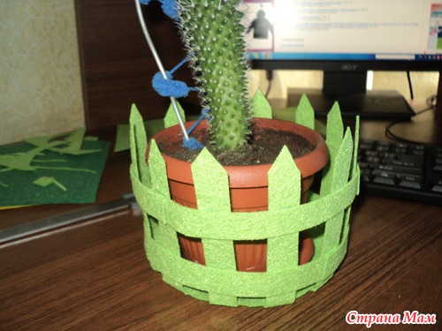 режем заборчик, ширина произвольная, длина - чуть выше высоты горшка и припуск 0,5 см на подгиб при приклеивании