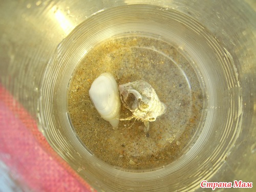 мы ему туда песочку, травинок... потом попалась мидия-я думала, просто ракушка двойная, а она ночью вылезла и пошла закапываться в другие ракушки... я ее с фонариком искала в 2 ночи.