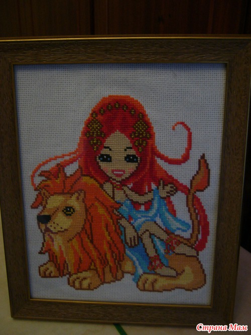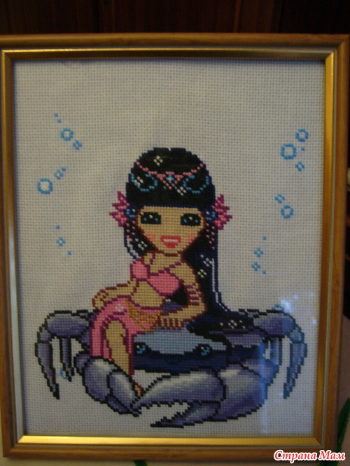 Я совсем недавно вступила в группу, да и опыта ещё маловато. Совсем недавно случайно нашла необычные знаки зодиака - с куклами, решила вышить дочке папин знак (рак), мамин (дева) и её собственный (лев). Два уже готовы, третий в процессе. Вышивала на канве Аида 14 мулине DMC в 3 сложения. Схемы из интернета.