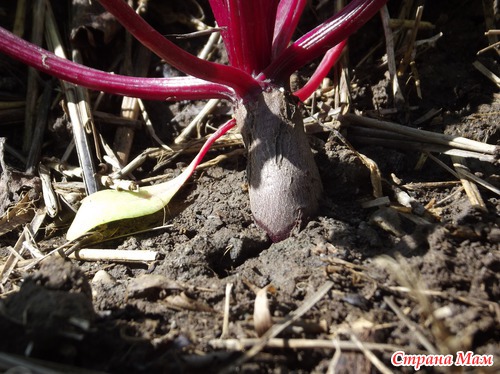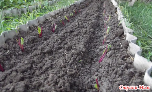 Делаем бороздки на том участке, где планируем рассадить свеклу. Бороздки поливаем. Рассаду сажаю, прижимая к одной из стеночек бороздки. Ростовая точка рассады (место, откуда растут черешки) должна находиться над поверхностью земли (землёй не засыпать - иначе рассада сгниёт).