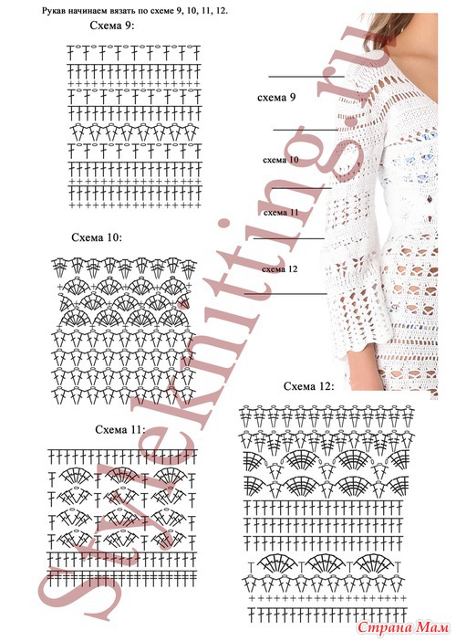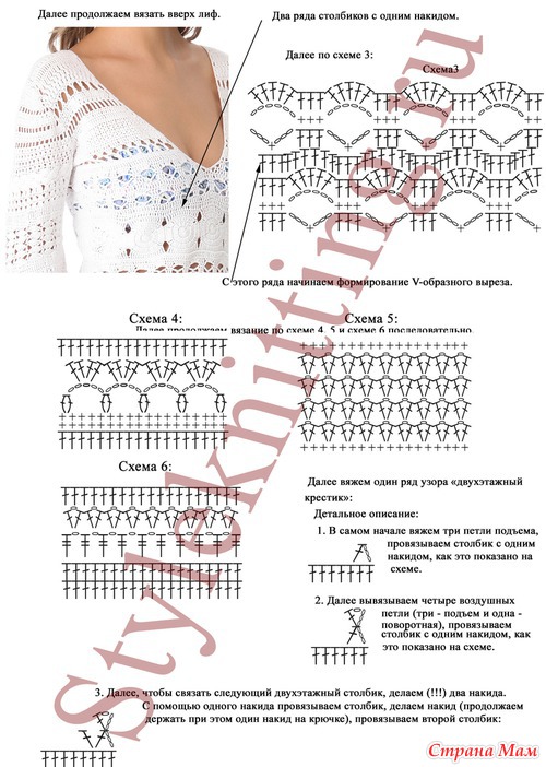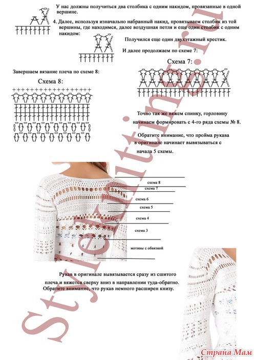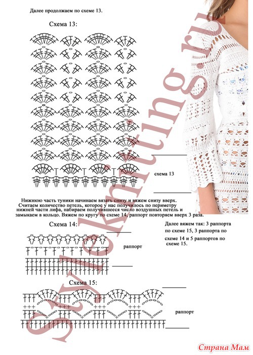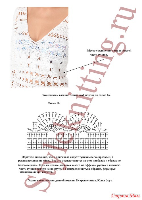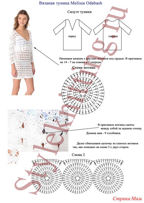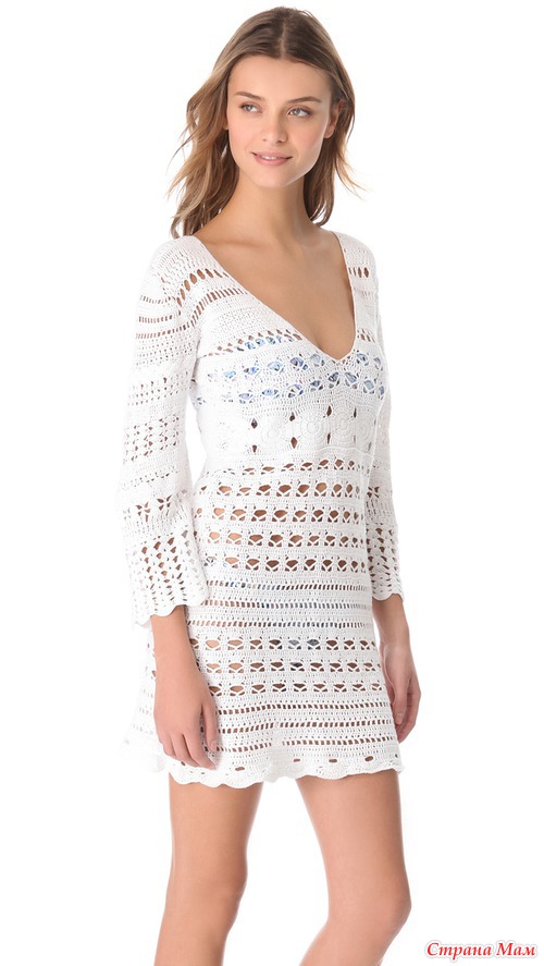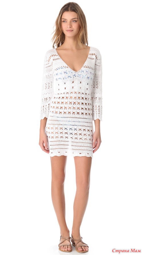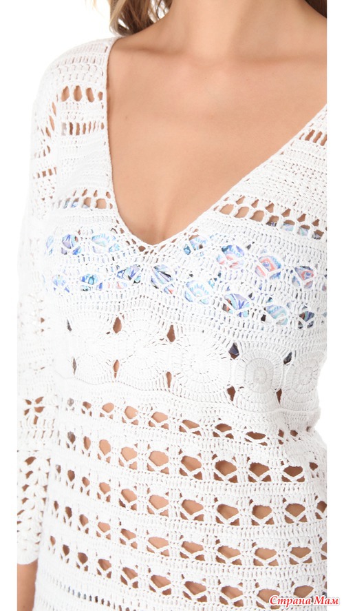 Данная вязаная туника, действительно, по-настоящему красивая вещь. Все-таки есть какое-то особое очарование и особая сексуальность в белых вязаных крючком вещах. Очень чувствуется дизайнерский подход в создании данной модели: несложного вида узоры очень удачно скомбинированы и очень органично сочетаются друг с другом. В оригинале туника связана из 100 % хлопка, V-образный глубокий вырез, рукава на три четверти отделанные волнистой каймой. Длина изделия от линии плеча – 81 см. В интернет-магазинах стоило от 170 до 250 долларов