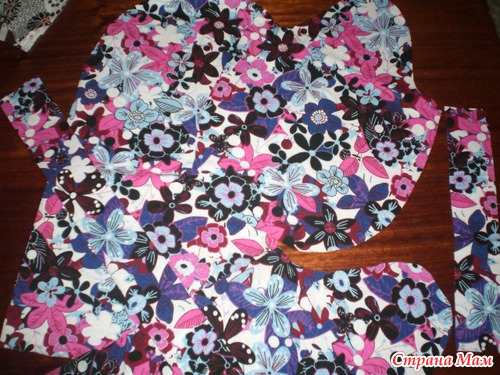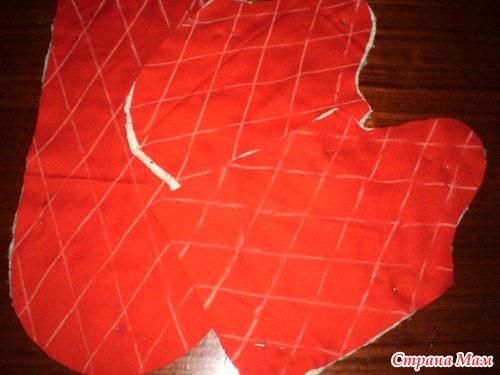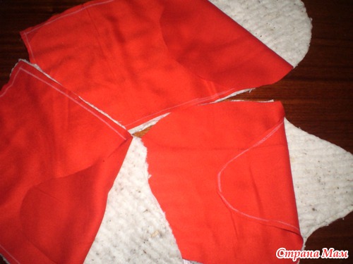 Раскроила сразу 3 материала: 1-ткань верха, у меня тонкий трикотаж х/б; 2-прокладочный материал, у меня ватин прошивной; 3- внутренняя ткань, х/б из залежей времен СССР.
