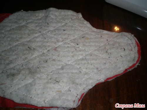 Сложила 2 и 3 слой, сколола булавками, нарисовала линии строчек для стёжки ( поленилась заменить лапку для стежки) и выстегала 3 детали.
