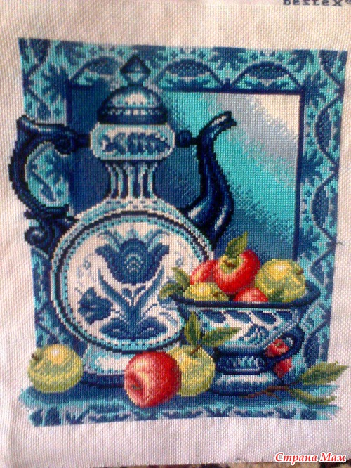 На мой взгляд далеко не гжель, оттенки не те что надо. Итог: работа закончена, но не подарена, лежит неоформленная в шкафу. К тому же осталось чувство неудовлетворенности... У вас так бывает?