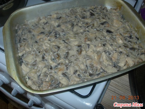 На том же масле обжарить лук, добавить к нему грибы и жарить до испарения жидкости. Всыпать муку, хорошо перемешать и, не переставая мешать, влить молоко со сливками, добавить курицу, соль и перец по вкусу.