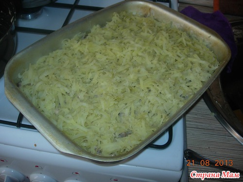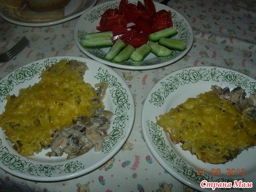 Курица с грибами, запеченная под картофельной шубой