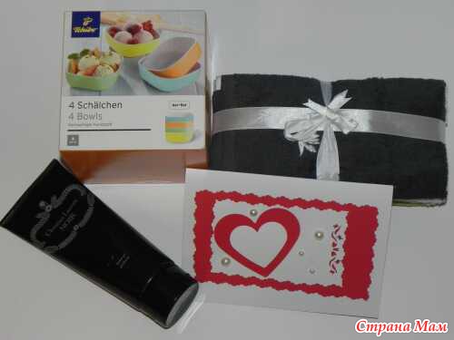 Открытка ручной работы, очень здоровская, с приятными пожелаиями, спасибо!!! Набор полотенчиков, набор мисочек от Tchibo и гель для душа мужской