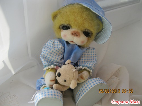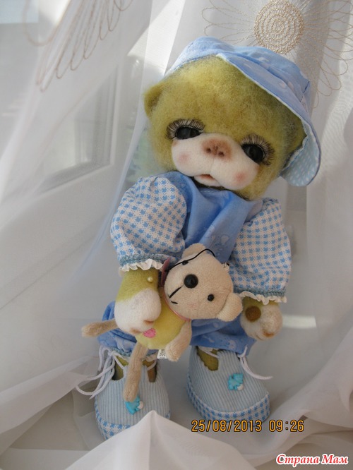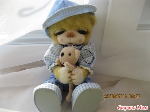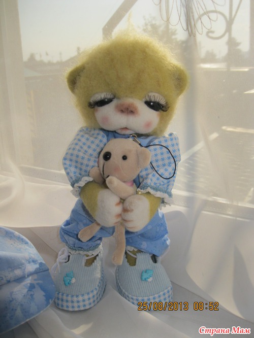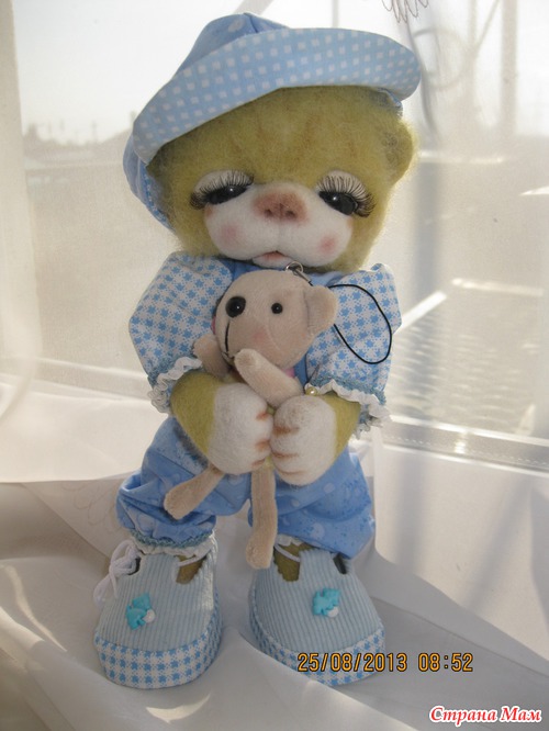 Тимоша маленький мишка. Ростиком 24 см. Глазки открываются и закрываются. Ротик открывается и закрывается. Лапки двигаются. Умеет стоять и сидеть. Очень любит играть и конечно поспать. Одежда ручной работы. Снимается. Мишка валяный из кардочоса и мериноса. Лапки в локтях сгибаются. Читать полностью