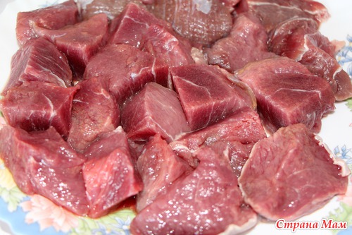 Для начала прикупила говядинки такой нарядной. Порезала средними кусочками