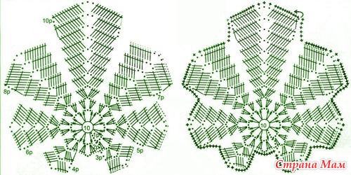 Первые 5 рядов вяжутся крючком по кругу, при этом в начале каждого ряда первый столбик с накидом заменяется на три воздушных петли (это не обозначено на схеме).