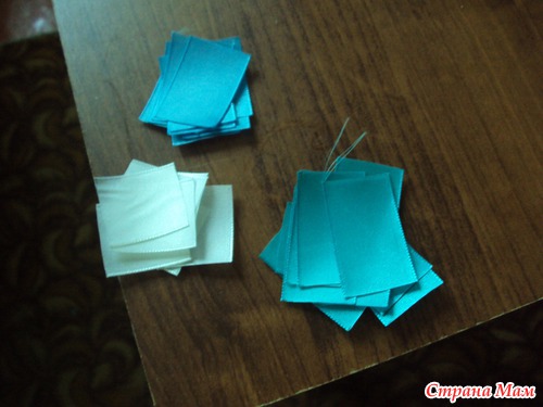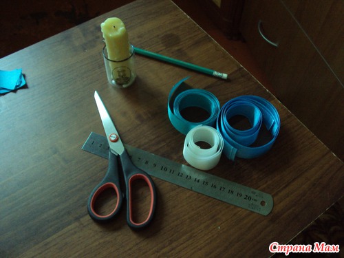 Нарезаем наши ленты отрезками по 4, 3.5 и 3 см. У меня белая - 3 см *8 шт, голубая - 3,5см * 10 шт, бирюзовая 4см*10 шт.