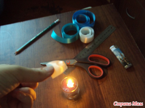 Для них нам понадобится: Ленты шириной 2,5 см трёх сочитающихся цветов, ножницы, линейка, карандаш, свечка или зажигалка (здесь паяльник не поможет) и клей, и заготовочка с заколкой, на которую будем крепить цветок!