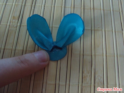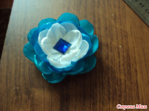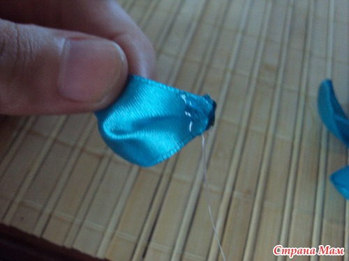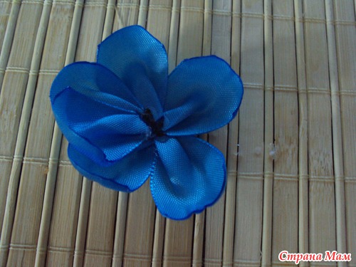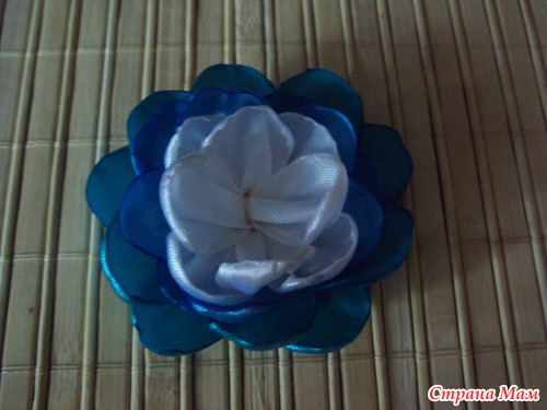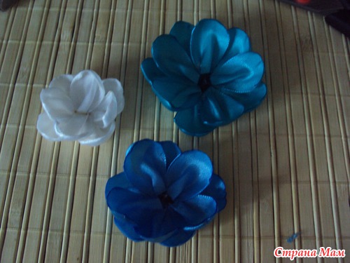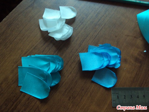 Аналогично первому цветочку собираем цветочки из голубой и белой ленты. Только учтите, что цветочек из самых маленьких лепестков состоит из 8 шт, т. е. Ряд нужно делать из 4 лепестков. И в каждом случае основание уменьшаем на 3-5 мм.