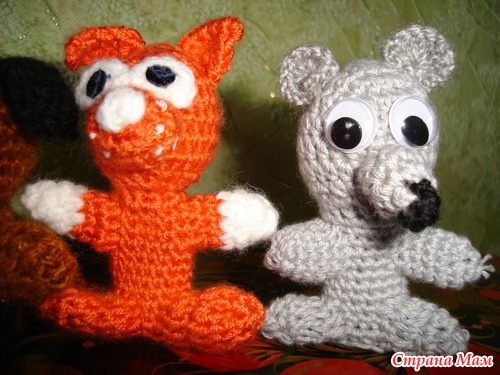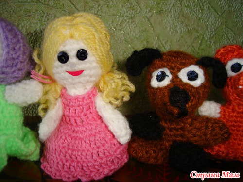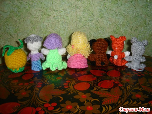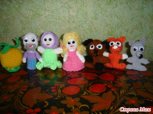 Воспитательница из дет. сада попросила меня связать вот такой театр. Я долго мучалась, старалась, думала что получится лучше, но увы - я расстроилась, но перевязывать не буду. Своим деткам показала, им понравилось, сидят играют. Только кошку обозвали лисой