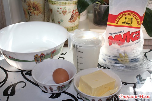 Растопила масло в кастрюле, добавила молоко и выключила плиту. Всыпала соль и сахар в тёплую смесь, размешала. Добавила яйцо(только смесь должна быть именно тёплой, а не горячей) Ещё раз всё тщательно размешала и стала добавлять муку, замешивая тесто. Оно должно получится мягким и эластичным, не липнуть к рукам. Готово! Накрываю плёнкой и даю ему постоять, пока занимюсь начинкой.