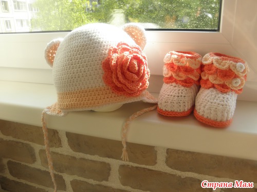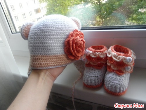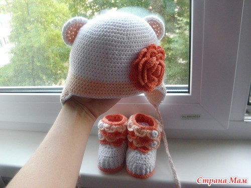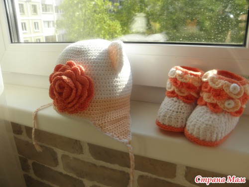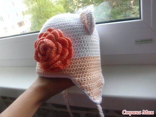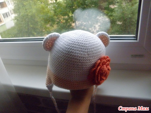 А небольшой совет примете? Цветок на шапочке лишний,громоздкий и все впечатление портит.Лучше бантик на ушко сделайте.Но это мнение только мое,пожалуйста не обижайтесь