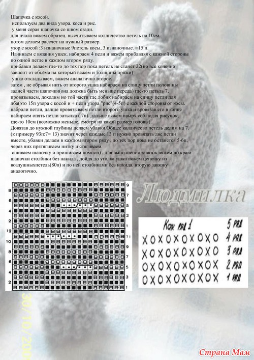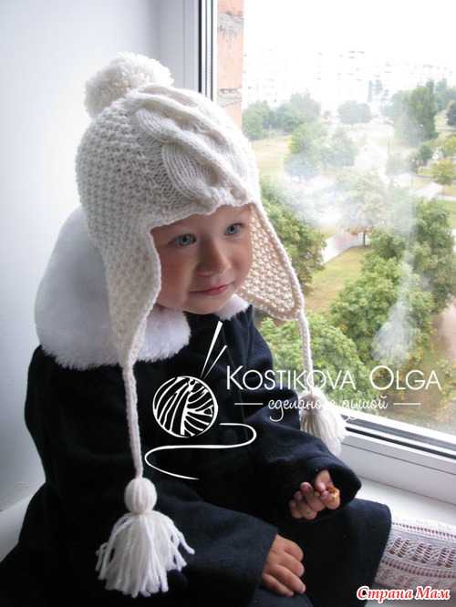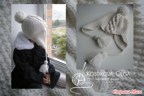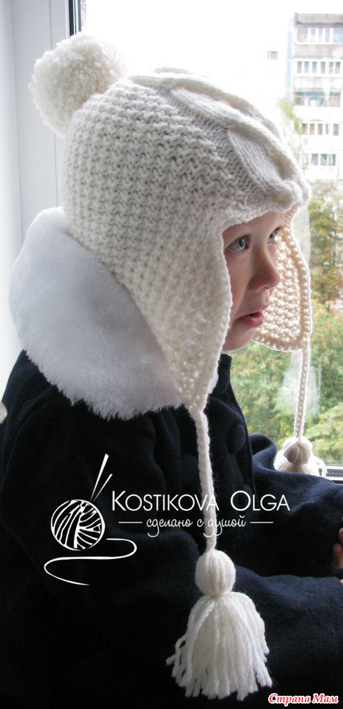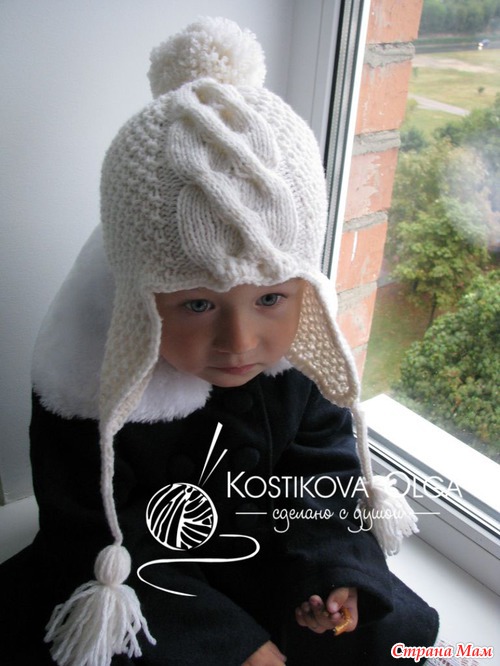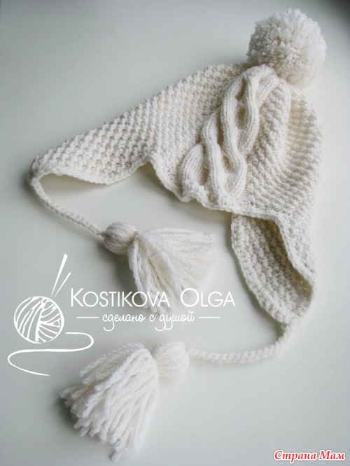 ушко: на спицы 3,5 набрала 4 петли, вяжу жемчужным узором (1 лиц., 1 изн., след. ряд по узору, а след. лицевой ряд: наоборот: над лицевой вяжу изнан., а над изнаночной - лицевую...), прибавляю с каждой стороны по 1 петле в каждом 2-м ряду, пока их кол-во не станет равно 20 (но ушки у меня широки, можно и на 16-18 остановиться), потом продолжаю вязать до высоты 10 см без прибавок. ушки у меня длинные, они декоративные, если нужно их завязывать, то делаем короче.