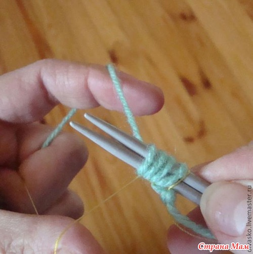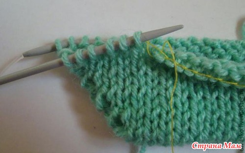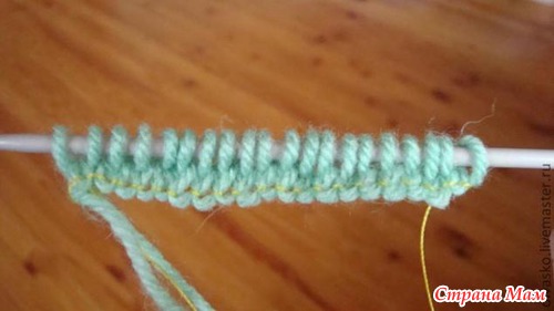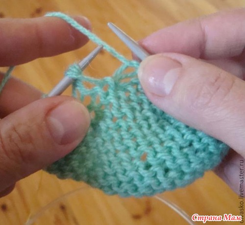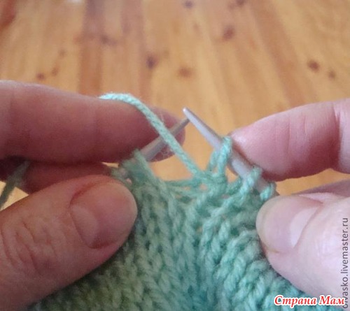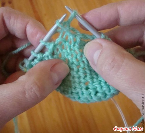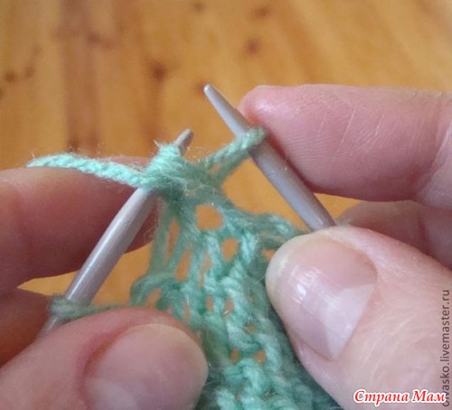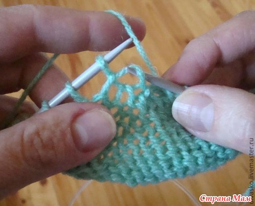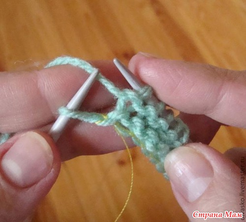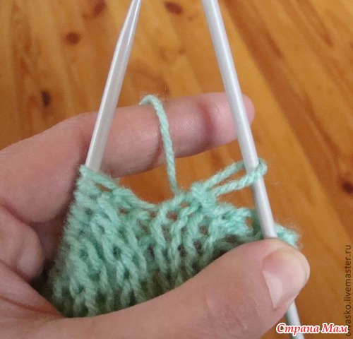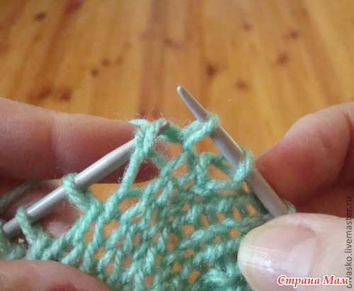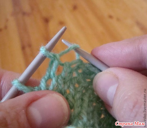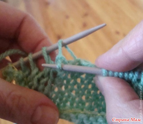 11. Вместе провязываем изнаночной петлей "парочку" на левой спице.