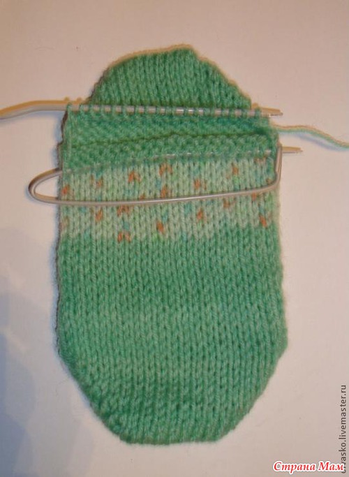 22. После вывязывания пятки половина петель на спице, другая - на булавке.
