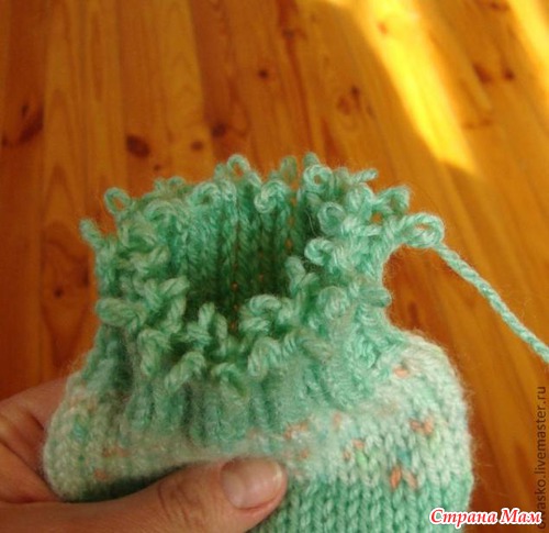 26. Если закрывать край обычным способом, петли вытягивайте побольше, иначе край носка не сможете растянуть.