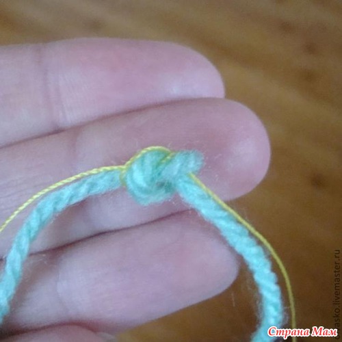1. Связываем в узелок основную нить и дополнительную длиной ок.30см. В качестве доп. нити лучше брать что-нибудь "скользкое"