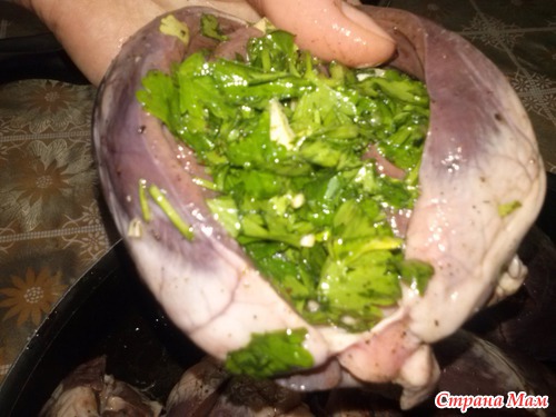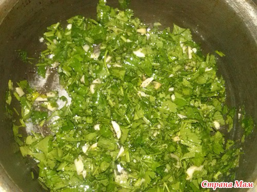 Готовим начинку --- нарезаем петрушку, острый перец, чеснок, выжимаем сок лимона, перчим, солим, немного раст. масла.