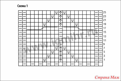 Планка-«коса». Набрать на спицы 25 п. и вязать след. образом: кром. п., 1 лиц. п., 21 п. по схеме 1, начиная с 9-го ряда, 1 п. лиц. глади, кром. На высоте 99 см, что соответствует 16 раппортам, закрыть петли.