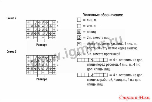 Резинка 2x2: вязать попеременно 2 лиц. п., 2 изн. п. Лицевая гладь: лиц. ряды - лиц. п., изн. ряды - изн. п. Узор «косы»: вязать по схеме 1. Узор «сетка»: вязать по схемам 2 и 3. Начало работы: 3 п. до 1-й стрелки, постоянно повторять раппорт между стрелками и завершить ряд 3 п. после стрелки. Пов¬торять 1-4-й ряды.