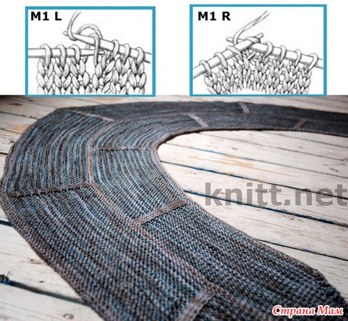 M1R: (прибавить 1 п. справа): левой спицей поднять протяжку между петлями движением сзади наперёд, провязать эту петлю лицевой.