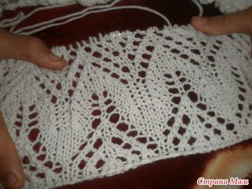 Вроде неплохо получилось.Вот только сомневаюсь не очень ли дыряво....может спицы по-меньше взять? Это на спицах №3.Хотя с другой стороны и должна быть ажурной..