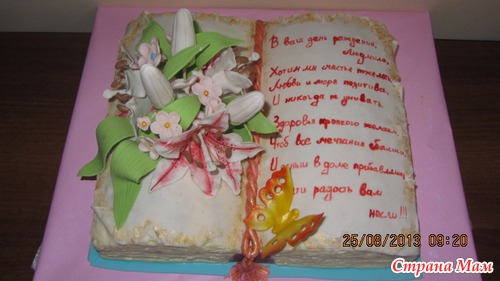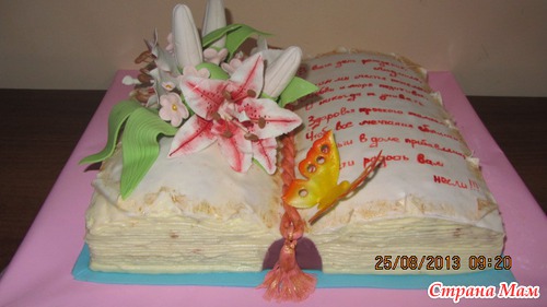 внутри торта ванильный бисквит, крем сливки со сгущенкой, киви и бананы, мармышковая мастика использовалась во всех украшениях торта. Только на боках, где должны быть странички я выровняла кремом и прочертила странички. Вес этого торта вышел 3 кг.