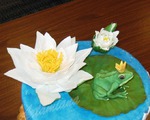 Покрытие - покупная мастика каллебаут, лягушка из покупной мастики "Принцесса" (ну очень мне понравилось из нее лепить!), цветы на проволоке из самодельной цветочной мастики. На фото не очень видно, но сделан эффект воды с помощью тонкого слоя декоргеля.